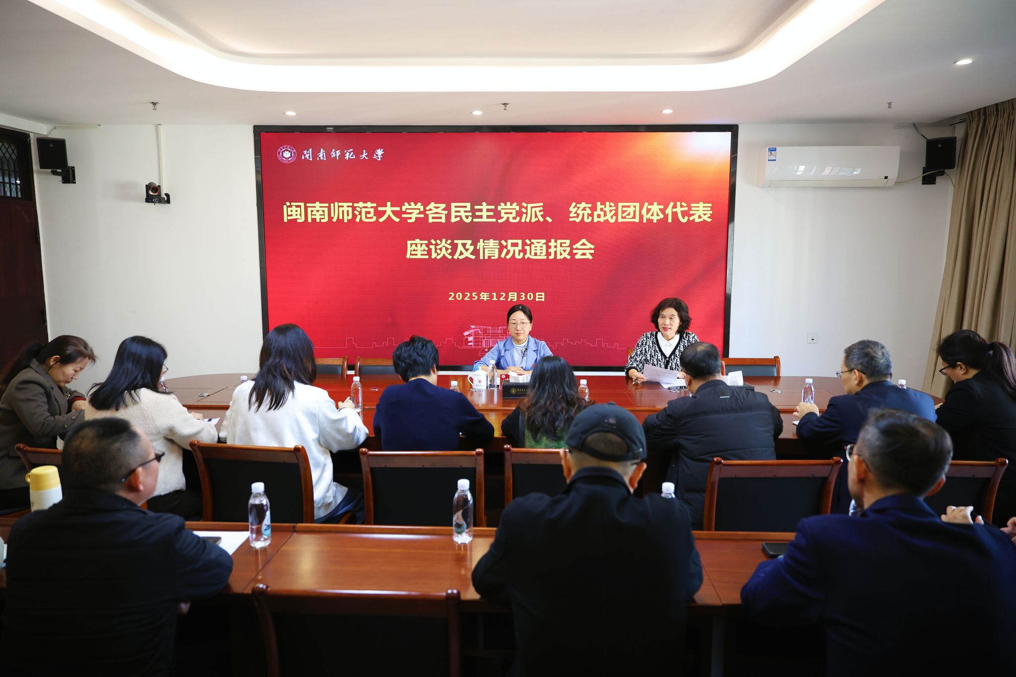 随后,廖志丹通报了中国共产党闽南师范大学第一届委员会第十一次全体(扩大)会议情况及学校2025年统战工作情况。她和与会代表一同回顾了学校党委在推进学科建设、人才培养、师资队伍、科研工作、社会服务、特色办学、对外合作等方面取得的显著进展与成绩,全面总结了过去一年学校统战工作在强化思想政治引领、聚焦中心服务大局、筑牢安全防线等方面取得的扎实成效。她表示,希望各民主党派、统战团体继续与学校党委同心同德、携手并肩,共同推动学校各项事业迈上新台阶、实现高质量发展。